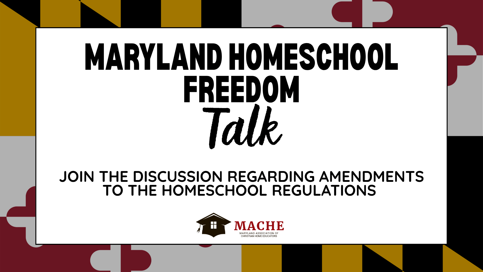 Thanks for joining MACHE’s Maryland Homeschool Freedom Talk! When you register, you’ll receive the Action Guide with key tips, resources, and updates to help you protect your homeschool rights in Maryland.